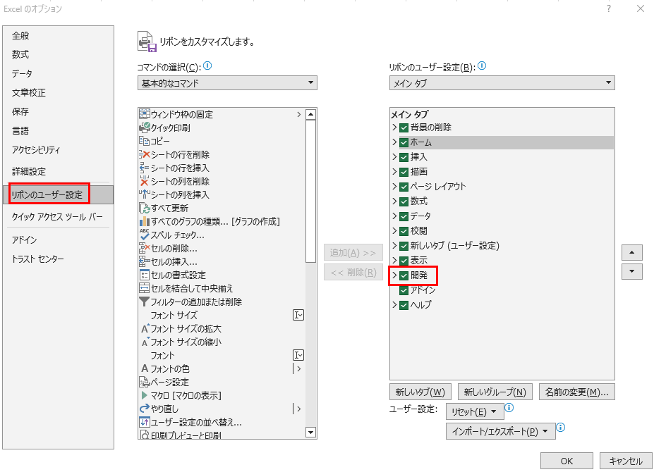 まず「開発」タブを表示する必要があります。開発タブが表示されていない場合は「ファイル」→「オプション」→「リボンのユーザー設定」で「開発」にチェックを入れてください。