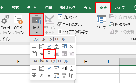 「開発」タブをクリックし、「挿入」ボタンをクリックします。「フォームコントロール」グループの中からスクロールバーのアイコン(縦長の矩形に矢印が付いたアイコン)を選択します。
