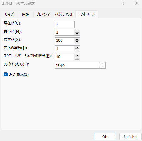 増分変更は矢印ボタンをクリックしたときの変化量、ページ変更はスクロールバーのバー部分をクリックしたときの変化量です。「リンクするセル」欄に値を反映させたいセル番地(例:$B$8)を入力して「OK」をクリックします。