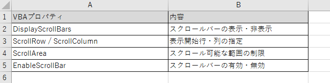 ・VBAによる制御:DisplayHorizontalScrollBar・DisplayVerticalScrollBarプロパティで表示・非表示を切り替え、ScrollAreaプロパティでスクロール範囲を制限できます。