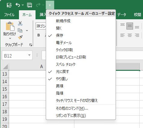 クイックアクセスツールバーの右端にある下向き矢印(ツールバーのユーザー設定)をクリックするか、リボン上の任意のボタンを右クリックして「クイックアクセスツールバーに追加」を選択します。