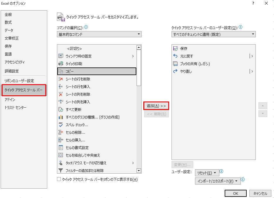 エクセルのショートカットキー設定方法1【クイックアクセスツールバーへの割り当て】