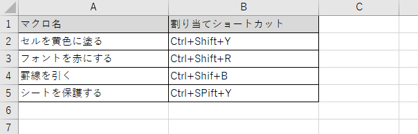 なお、既存のショートカットキー(Ctrl+C、Ctrl+V など)と同じキーを割り当てると、マクロのショートカットが優先されてしまうため注意が必要です。Ctrl+Shift+英字の組み合わせなど、既存のショートカットと重複しにくい組み合わせを選ぶのがおすすめです。