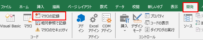 まず「表示」タブ→「マクロ」→「マクロの記録」をクリックするか、「開発」タブ→「マクロの記録」をクリックします。