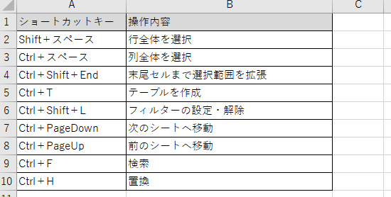 ・よく使うショートカット(選択・シート操作):Shift/Ctrl+スペースで行・列選択、Ctrl+PageDown/Upでシート切り替えができます。