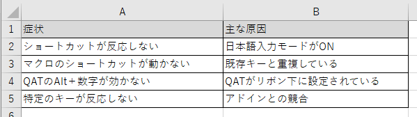 ・効かない場合の対処:日本語入力のオフ、キーの重複確認、QATの表示位置、アドインとの競合の順にチェックしましょう。