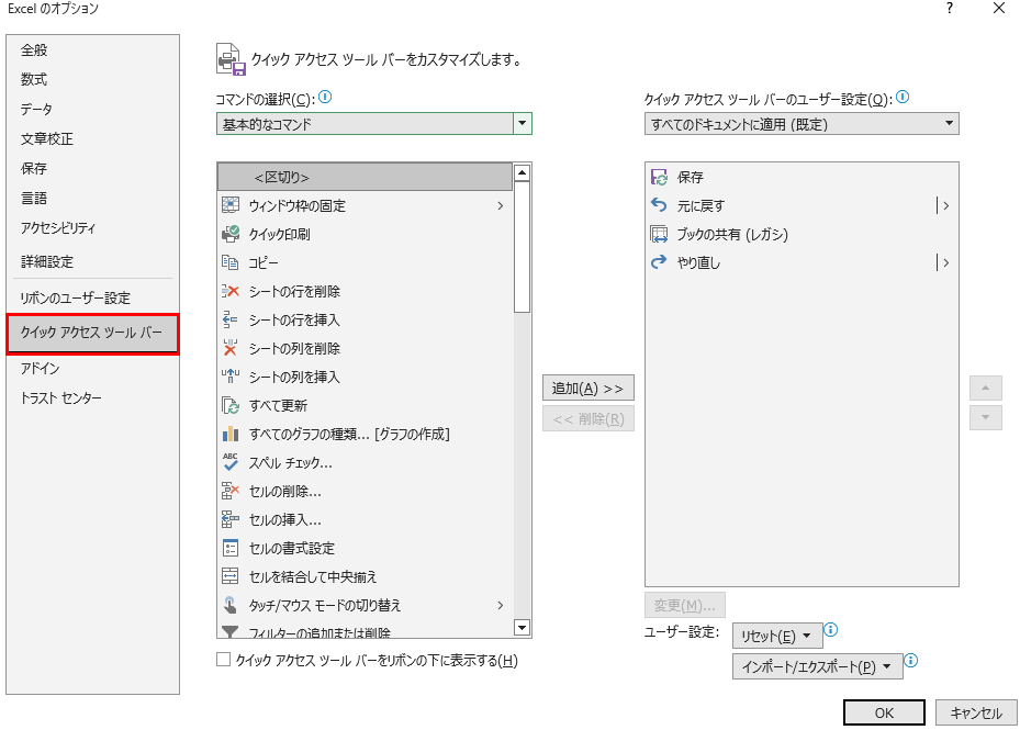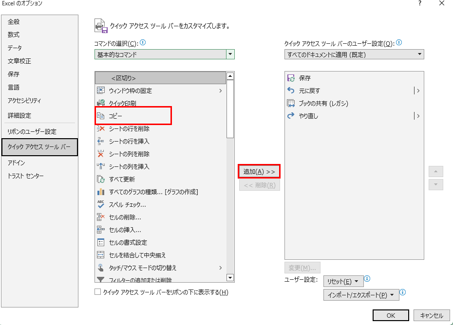 左側のコマンド一覧から追加したい項目を選択して「追加」ボタンをクリックすれば、クイックアクセスツールバーに表示されるようになります。