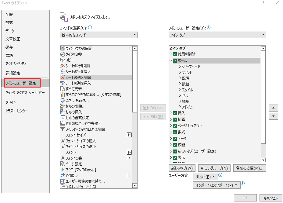 エクセルの設定をカスタマイズすることで、よく使う項目だけを表示したり、独自のコマンドを追加したりできます。