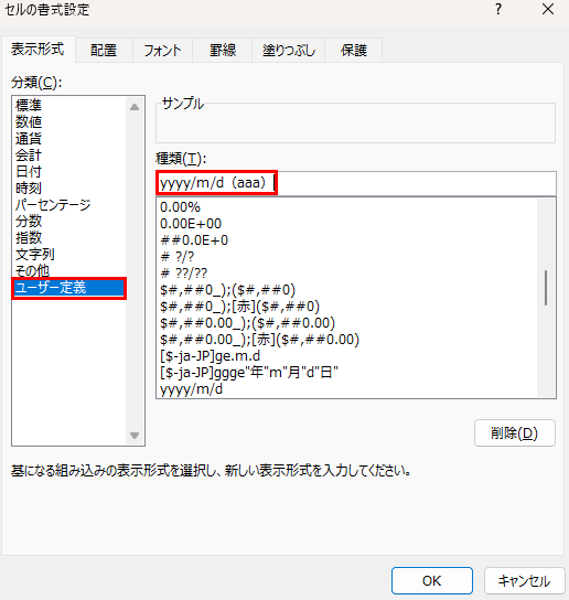 日付に曜日を自動表示するユーザー定義の設定方法