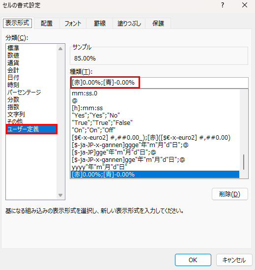 「[赤]0.00%;[青]-0.00%」と設定すると正の数値は赤で正のパーセント表示・負の数値は青で負のパーセント表示になります。