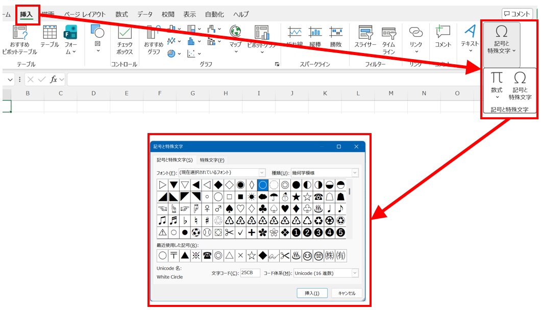 エクセルで記号の出し方2【記号と特殊文字ダイアログを使う方法】