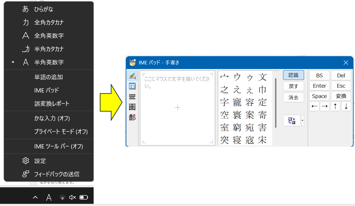 タスクバーのIMEアイコンを右クリックして「IMEパッド」を選択し、「手書き」タブでマウスやタッチパネルを使って記号の形を描くと、似た文字が候補として表示されます。