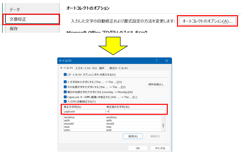「ファイル」→「オプション」→「文章校正」→「オートコレクトのオプション」と進み、「入力中にオートコレクト」タブで「修正文字列」に入力トリガーとなる文字列を、「修正後の文字列」に記号を登録します。