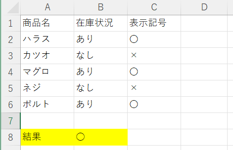 | 行 | A列:商品名 | B列:在庫状況 | C列:表示記号 |