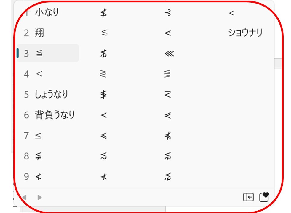 「しょうなり」と入力すると「<」(小なり)が、「だいなり」と入力すると「>」(大なり)が変換候補に表示されます。