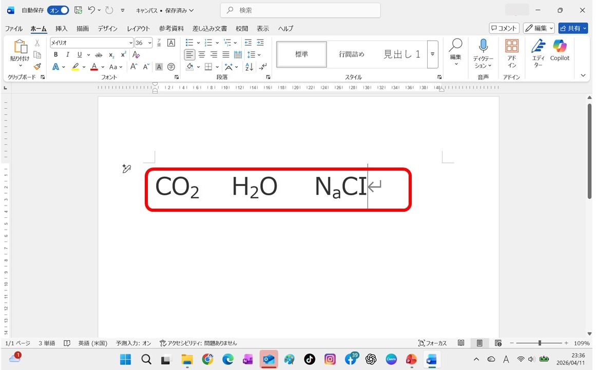 「CO₂」「NaCl」など理科・化学の文書でよく使う化学式もこの方法で正確に入力できます。