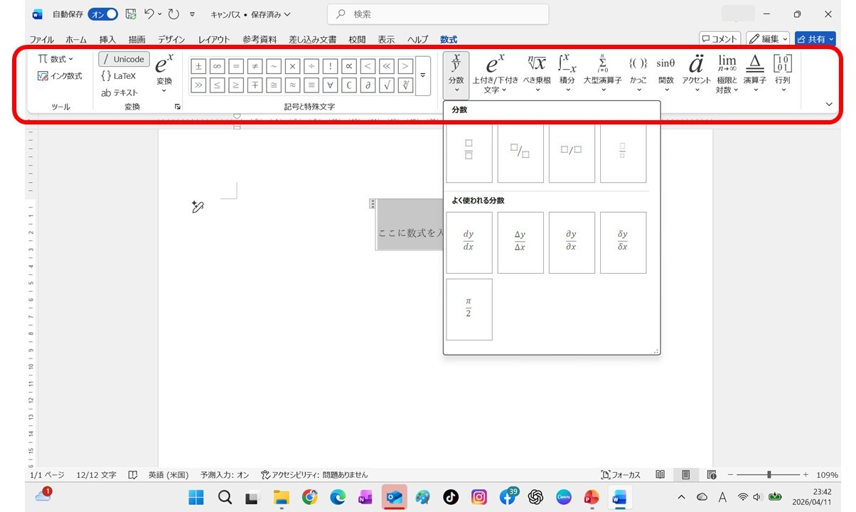 「Alt+Shift+=」のショートカットキーを押すと数式入力モードが起動し、数式専用のリボンが表示されて分数・ルート・積分・行列などの記号を簡単に挿入できます。