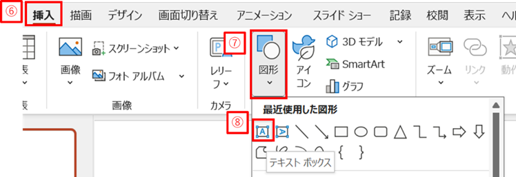 リボン[挿入]タブ(下図⑥)より[図形](下図⑦)をクリックし、[テキストボックス](下図⑧)を選択しましょう。
