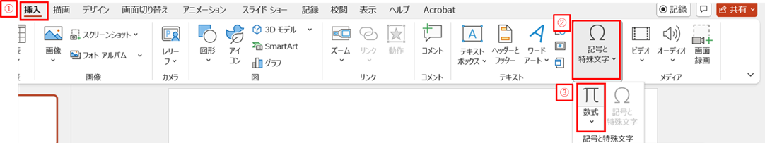 リボン[挿入]タブ(下図①)より[記号と特殊文字](下図②)をクリックし、[数式](下図③)を選択しましょう。