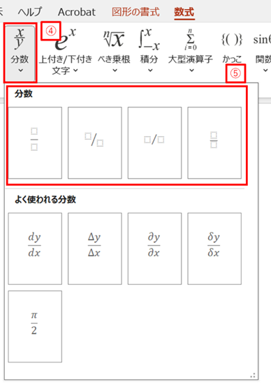 [分数](下図④)をクリックし、分数のデザイン内(下図⑤)より好みのデザインを選びましょう。