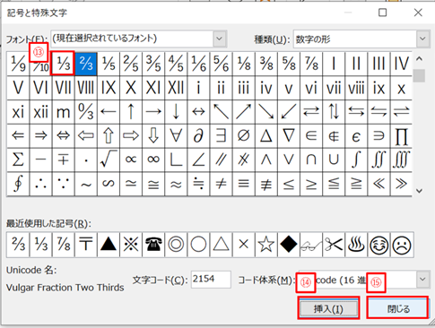 一覧の中より必要な文字(例 ここでは1/3)(下図⑬)をダブルクリックする、または選択して[挿入](下図⑭)をクリックし、[閉じる](下図⑮)を選択しましょう。