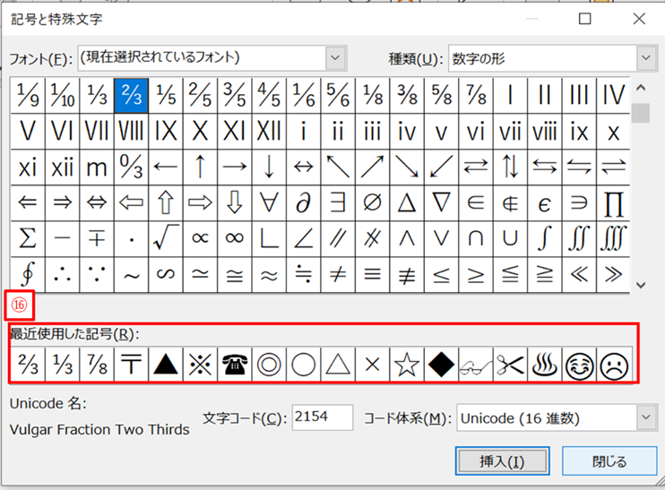 この方法では、一度選んだ分数が[最近使用した記号](下図⑯)に表示されるため、同じ分数を何度も使用したい場合に役立つでしょう。