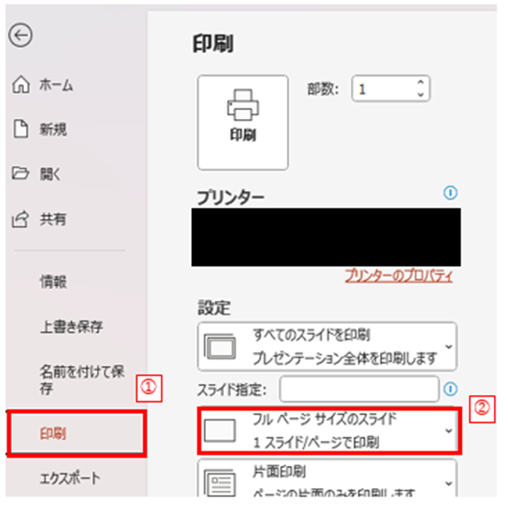 リボン[ファイル]タブより[印刷](下図➀)をクリックし、[フルページサイズのスライド](下図➁)を選びましょう。