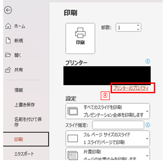 [プリンターのプロパティ](下図➃)をクリックしましょう。