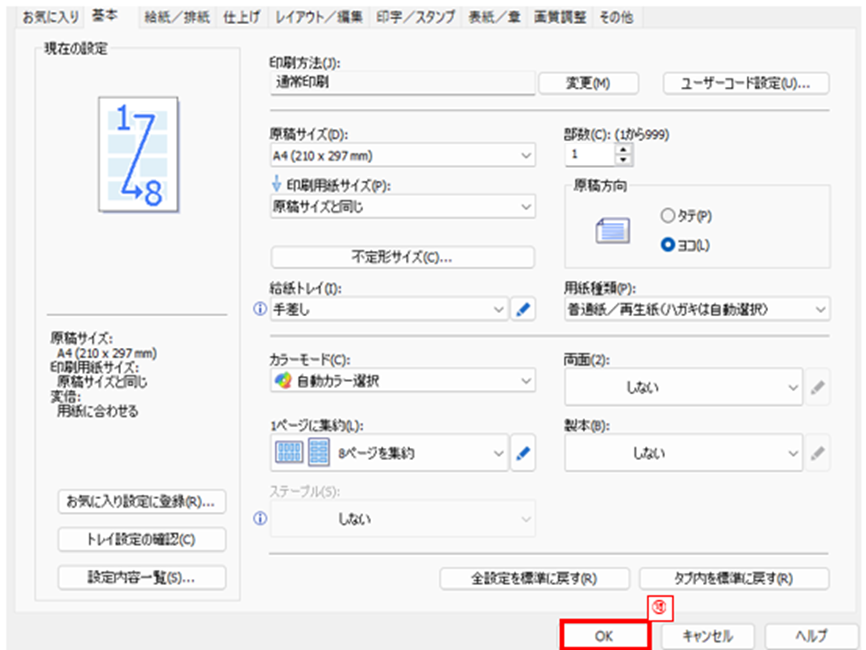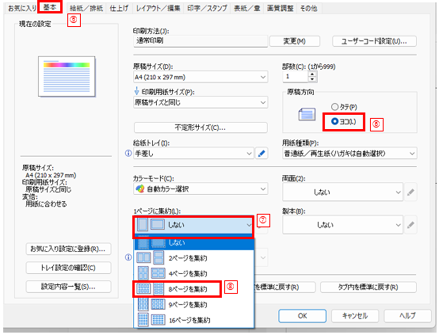 さらに[1ページに集約]の[しない](下図⑦)をクリックすると集約するページ数が指定できるため、希望する集約数を選択しましょう。(下図⑧) (希望する集約数が無い場合は希望以上のページ数を選択しましょう。)