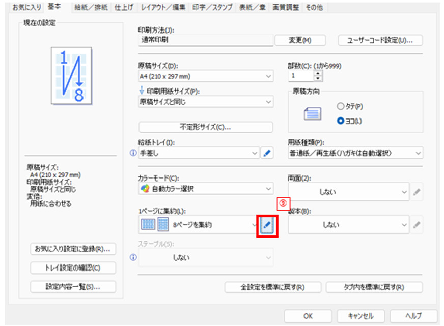 先ほど選択した1ページの集約数横にある鉛筆マーク(下図⑨)をクリックしましょう。