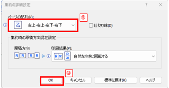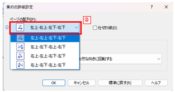 すると[集約の詳細設定]ダイアログボックスが開くので、[ページの配列]下のボタン(下図⑩)をクリックし、希望する配列を選択しましょう。