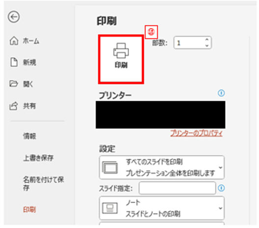 まずはスライドとノートが印刷できるように設定します。