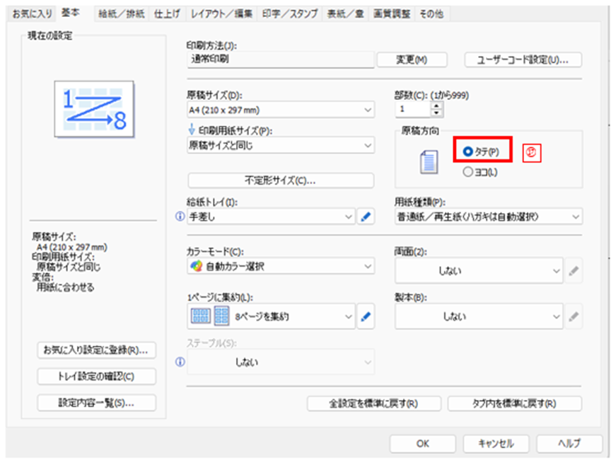 1.の手順と同様に[プリンターのプロパティ]をクリックし、[原稿方向]の[タテ](下図⑰)にチェックを入れましょう。