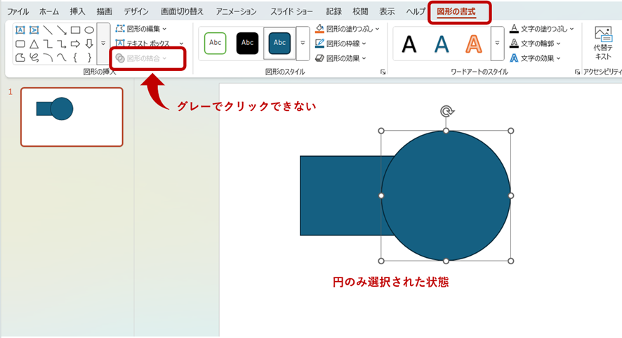 下の画像では、円の図形のみ選択された状態で[図形の結合]を見てみると、文字がグレーで表示されていない状態です。