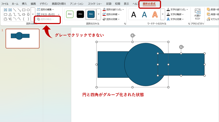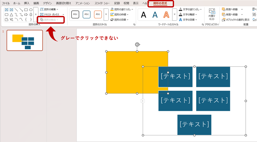 図形と結合しようとしている図形がグループ化されている場合も、 リボンの中に[図形の結合]が表示されません。