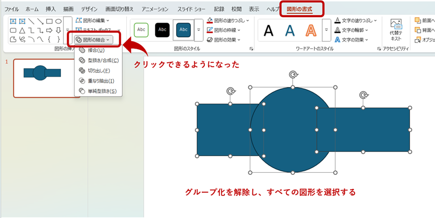 円と四角両方の図形を選択すると[図形の結合]をクリックできるようになりました。
