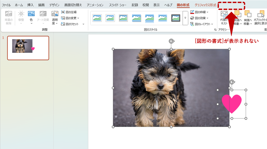 しかし、[図形の結合]が表示される[図形の書式]タブが表れず、リボンの中に[図形の結合]ボタン自体が表示されません。