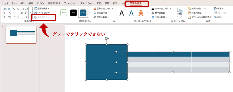 図形と表を選択して[図形の書式]→[図形の結合]をクリックしようとしても、文字がグレーでクリックできない状態になります。