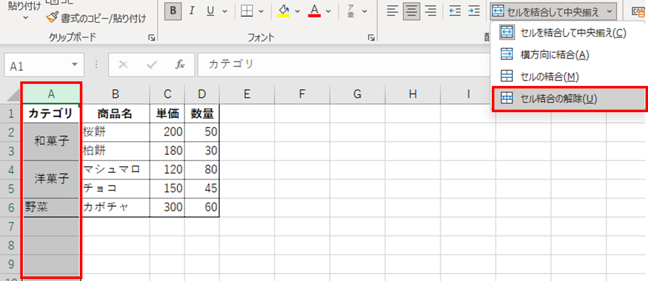 結合セルが含まれる列全体を選択し、「ホーム」タブの「セルを結合して中央揃え」ボタンの矢印から「セル結合の解除」をクリックします。