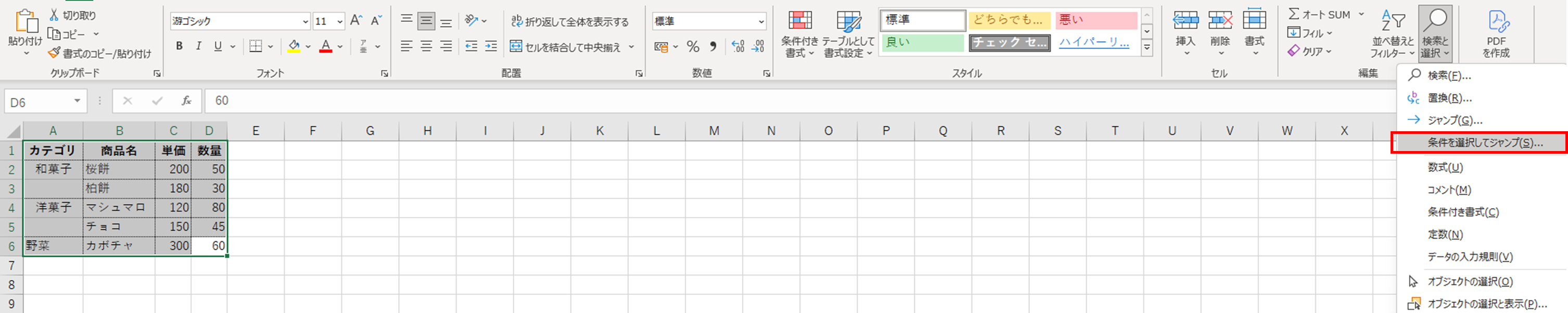 空白になったセルを埋めるには、対象列を選択した状態で「ホーム」タブ→「検索と選択」→「条件を選択してジャンプ」→「空白セル」を選択してOKをクリックします。