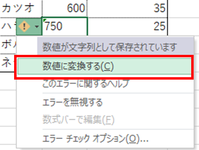 文字列として入力されている数値を数値に変換するには、対象セルを選択して表示されるエラーインジケーター(緑の三角マーク)の「!」アイコンをクリックし「数値に変換する」を選択します。