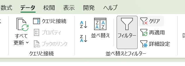 全データを対象に並び替えを行いたい場合は、まず「データ」タブの「クリア」ボタンをクリックしてフィルターの絞り込み条件をすべて解除します。