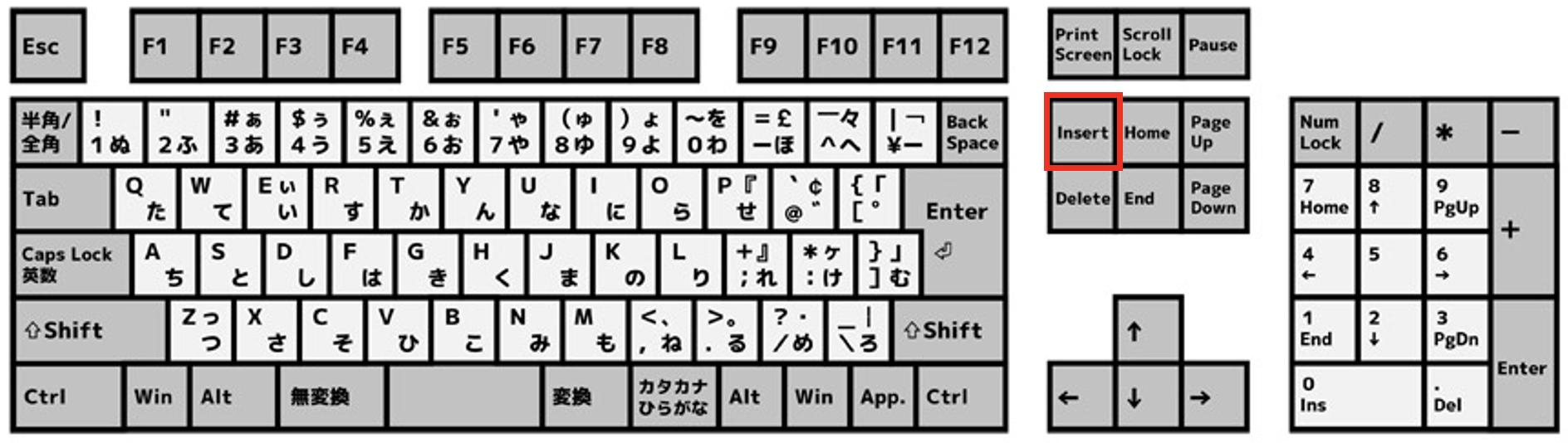 InsertキーはWindowsキーボードに標準搭載されているキーで、押すたびに「挿入モード」と「上書きモード」を交互に切り替えることができます。