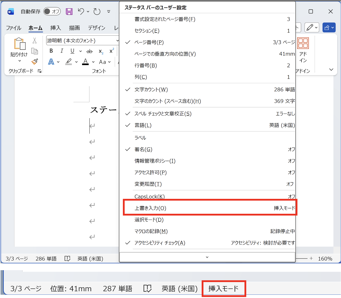 ワードの上書きモードを解除する方法2【ステータスバーから操作する】