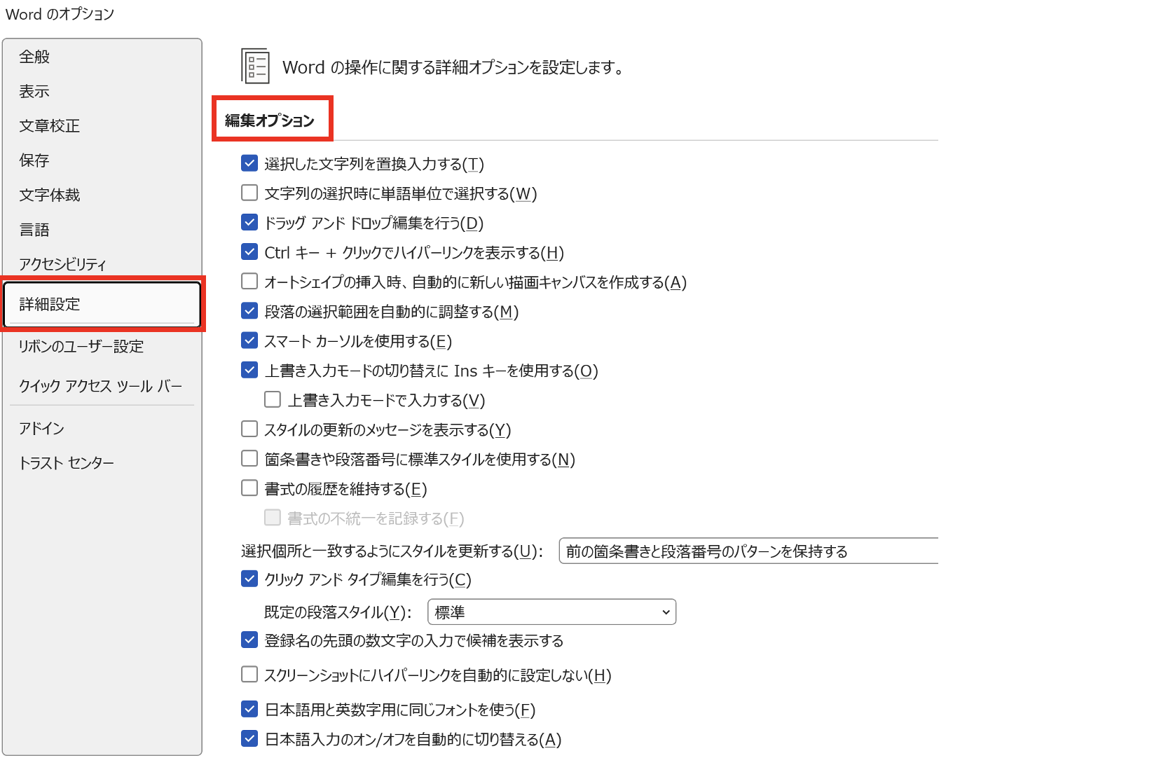 ワードの上書きモードを解除する方法3【Wordオプションの詳細設定から変更する】