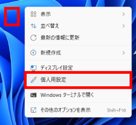 デスクトップの何もないところを右クリック、 「個人用設定 」をクリックします。