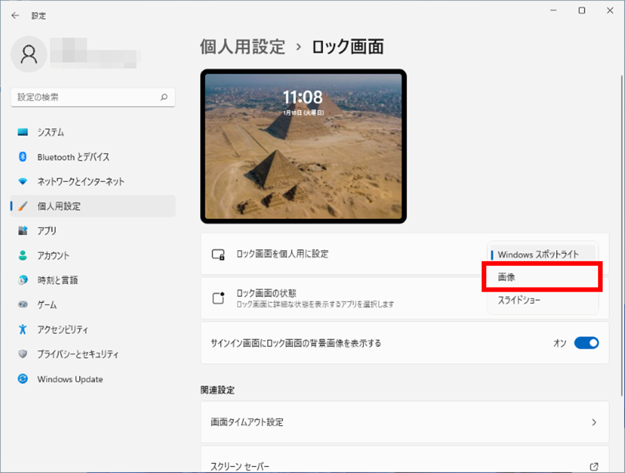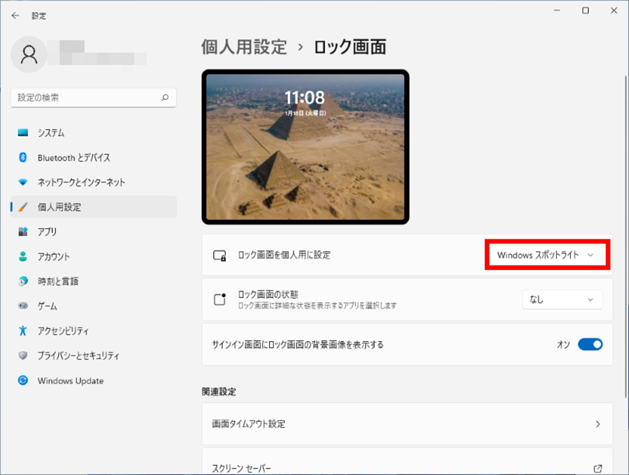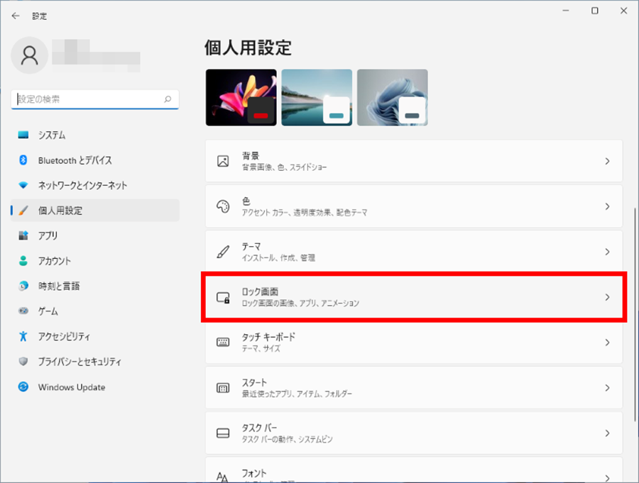 「設定」→「個人用設定」→「ロック画面」を開く。