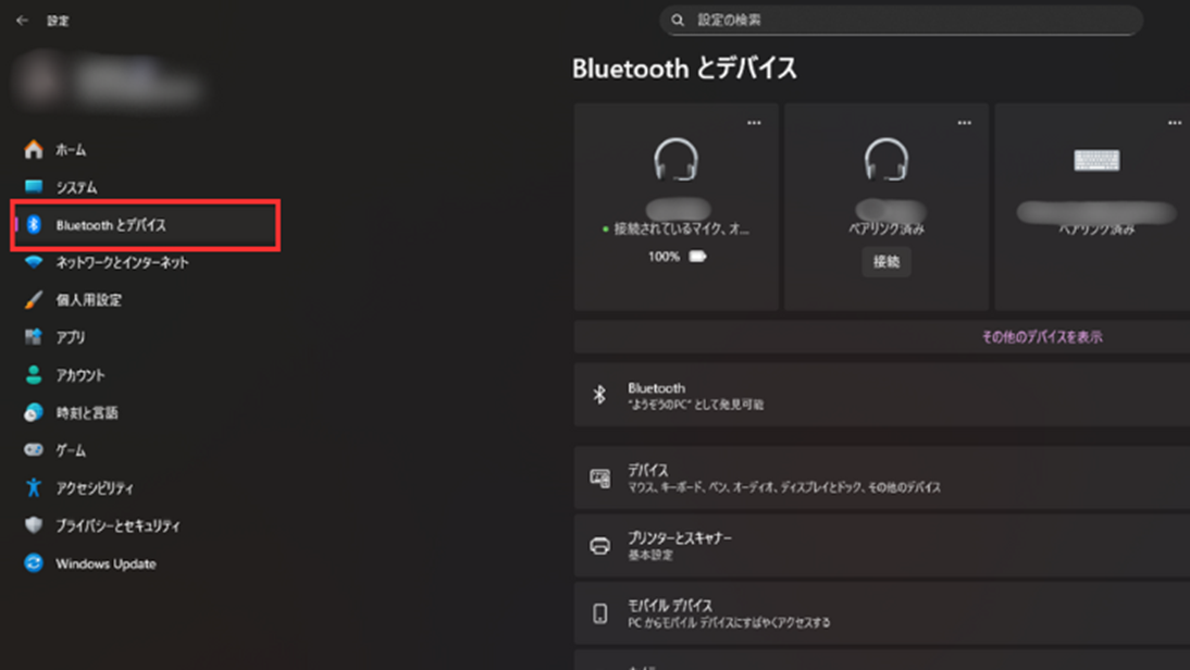 まずスタートメニューから「設定」を開き、「Bluetooth とデバイス」を選択します。