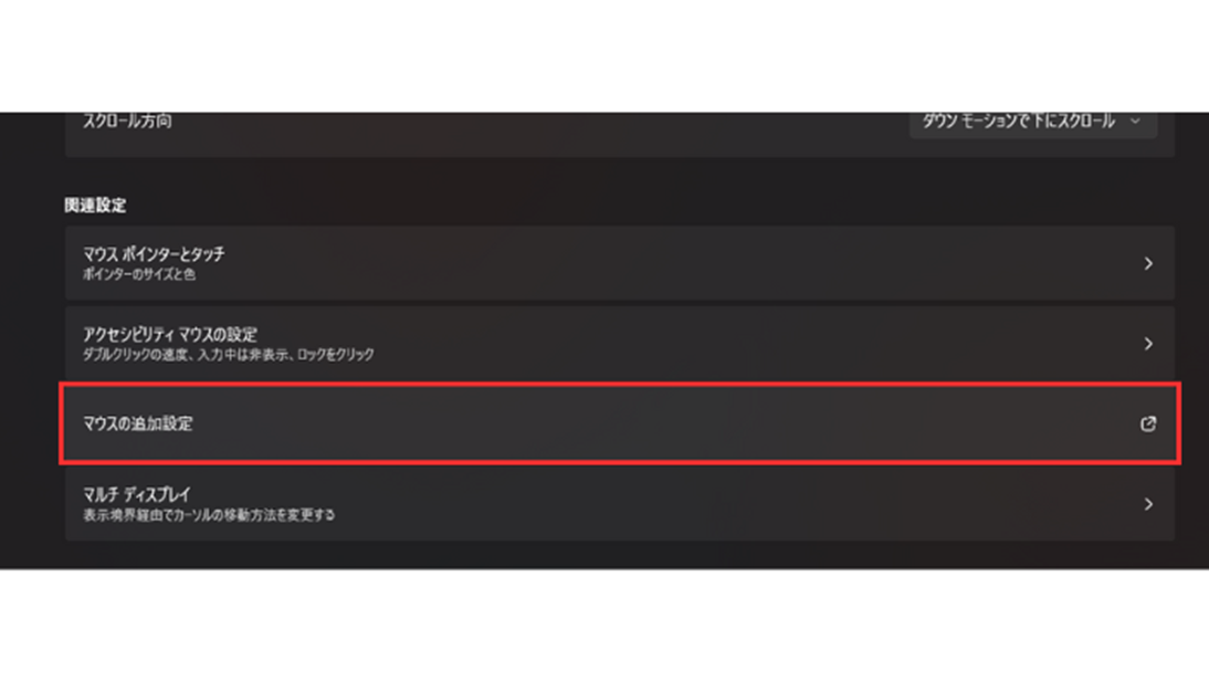 左側のメニューから「マウス」をクリックし、関連設定から「マウスの追加設定」を選択しましょう。