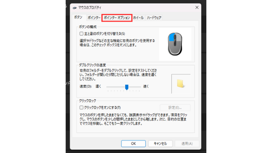 マウスのプロパティが開いたら、「ポインターオプション」タブをクリックします。